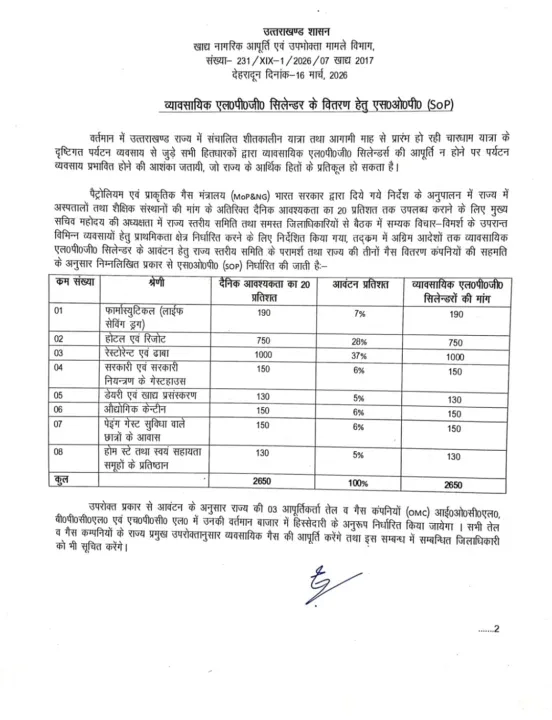प्रदेश में शीतकालीन यात्रा के साथ ही अगले महीने से चारधाम यात्रा शुरू होने जा रही है। ऐसे में होटल, रेस्टोरेंट और अन्य पर्यटन व्यवसाय से जुड़े लोगों ने गैस की कमी को लेकर चिंता जताई थी। सरकार का मानना है कि इस एसओपी से पर्यटन और स्थानीय कारोबार पर पड़ने वाले नकारात्मक प्रभाव को रोका जा सकेगा।